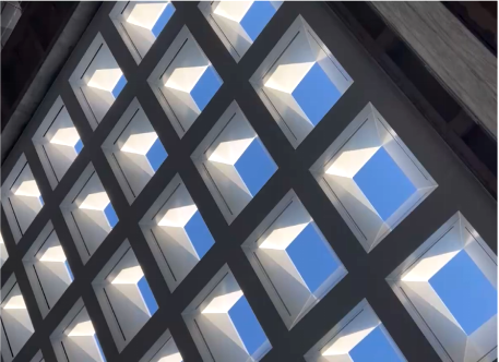 建筑美學:建筑內(nèi)部空間流動活潑,以多維度的層次感與流動性喚醒豐富的空間體驗;建筑外立面采用橫向條形玻璃窗與啞光藍色鋁板交替構(gòu)成,形成簡潔的現(xiàn)代韻律。同時中庭的空間構(gòu)架在光影交織中勾勒出虛實交錯的幾何敘事。